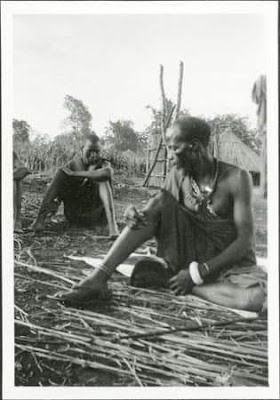 Anuak King: A man seated on the ground near his homestead (identified as King Aguaa-war-Akuon of Obuodhi village) sitting on floor covering, with seated youths to the side. He is wearing the royal strings of beads, which are used to invest all new Anuak kings, and are identified with the founder of the nobles lineage. It is possible that this occasion was the re-confirmation by the administration and nobles of Aguaa as king in 1935, having first held them in 1932. Circa 1935